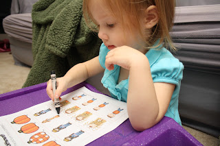 Bella's was more difficult because she had to match the dot marker with the colored circled. These activities are good for her because she is not very meticulous at things she does and she can have a tendency to rush things. So this slowed her down enough were she learned to take her time but not so much that it frustrated her.